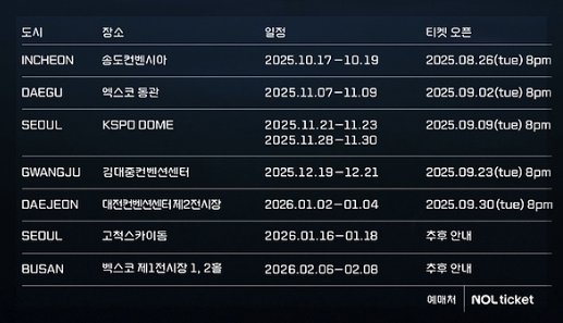 서울 공연은 2025년 11월 10일부터 12일까지 올림픽공원 체조경기장에서 개최되며, 부산은 11월 17일, 대구는 11월 24일, 광주는 12월 1일 예정입니다. 이 외에도 대전, 인천, 수원 등 다양한 도시에서 공연이 계획되어 있습니다.