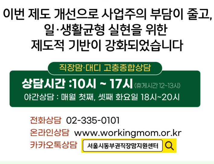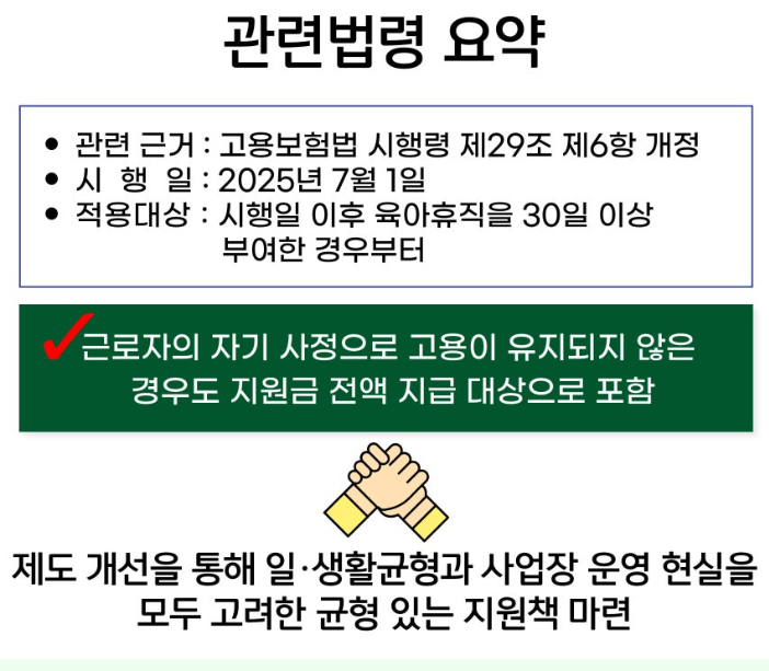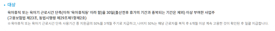 사업주의 사업장 규모나 업종, 고용보장 가입 상태에 따라 신청 가능 여부가 다를 수 있어, 고용센터 확인 후 신청하는 것이 좋습니다. 대체 인력을 채용하면 추가 지원이 가능하지만, 육아휴직 사업주 지원금과는 별도로 운영됩니다.
