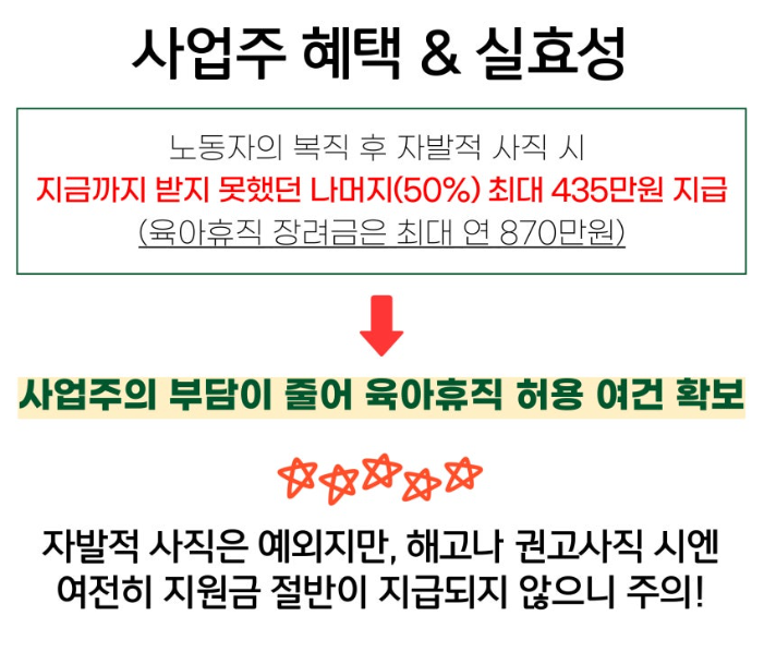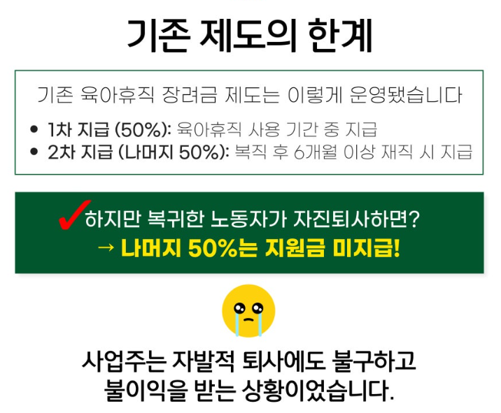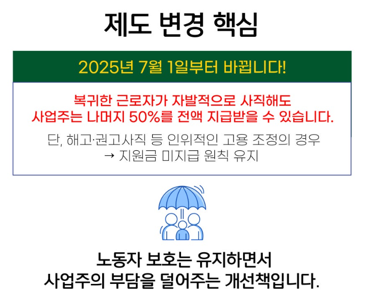 단, 동일 근로자가 이전에 육사용한 경우 중복 지원은 불가합니다. 또한 사업주가 고용유지 의무를 위반하거나 부당 해고 등 위법 행위가 있는 경우 지원금 지급이 제한될 수 있습니다.