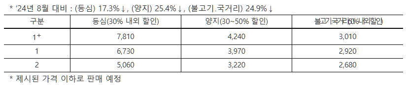 1+등급 기준으로 등심은 100g당 6,730원, 양지는 3,970원, 불고기·국거리는 2,920원 이하로 판매됩니다. 이는 지난해 8월 평균 소비자가격 대비 등심 17.3%, 양지 25.4%, 불고기·국거리 24.9% 저렴한 수준입니다.