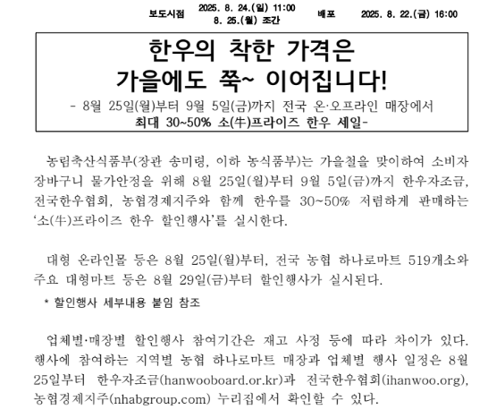 농림축산식품부는 한우 소비 촉진과 장바구니 부담 완화를 위해 ‘소프라이즈 한우 반값 할인행사’를 기획했습니다. 8월 25일부터 9월 5일까지 약 12일간 진행되며, 한우자조금, 전국한우협회, 농협경제지주 등과 협력해 마련된 대규모 행사입니다.