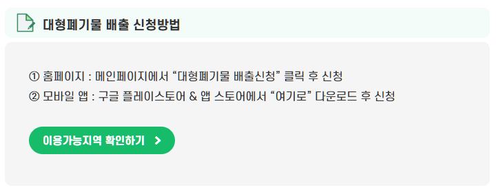여기요 홈페이지에서는 대형폐기물 이용가능지역을 확인한 후 신청이 가능합니다. 폐가전 무상수거에 대해서도 자세히 확인하실 수 있습니다. 홈페이지는 모바일 어플로도 이용가능하니 참고 바랍니다.