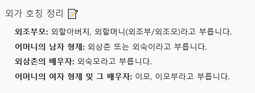 어머니의 자매분들은 ‘이모’라고 부르고, 이모의 남편분들은 ‘이모부’라고 부릅니다. 외가 가족 호칭 역시 친가 못지않게 중요하며, 정기적인 만남을 통해 더욱 친밀한 관계를 형성하게 됩니다.