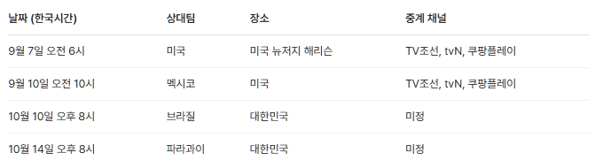 - TV 중계: 9월 미국과 멕시코 원정 경기는 TV조선과 tvN에서 실시간으로 생중계될 예정입니다. 10월 국내 평가전 역시 주요 지상파 또는 스포츠 전문 채널에서 편성될 가능성이 크니 방송사 편성표를 미리 체크하세요.