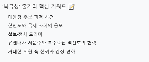 2025년 9월 현재, '북극성' 드라마의 결말은 아직 미공개 상태입니다. 하지만 주요 스토리라인은 서문주와 백산호가 한반도를 위협하는 거대한 진실의 실체를 밝혀내는 데 집중될 것으로 예상됩니다.