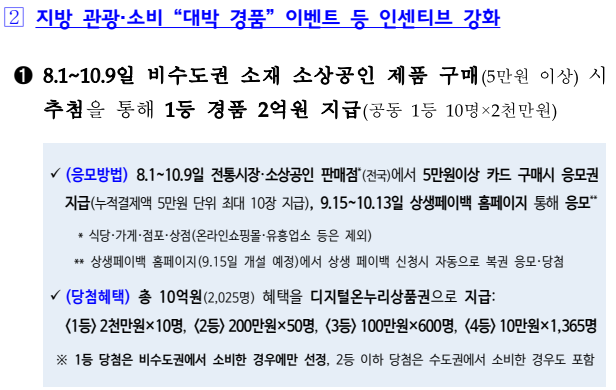 특히 비수도권 지역에서 소비한 실적이 있으면 1등 당첨자 선정에 유리한 점이 있으니, 지방 주민은 물론 수도권 거주자도 비수도권 소비 실적이 있으면 꼭 응모할 수 있습니다.